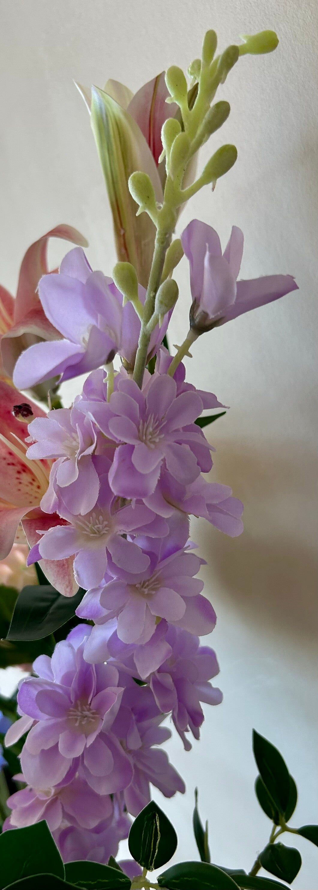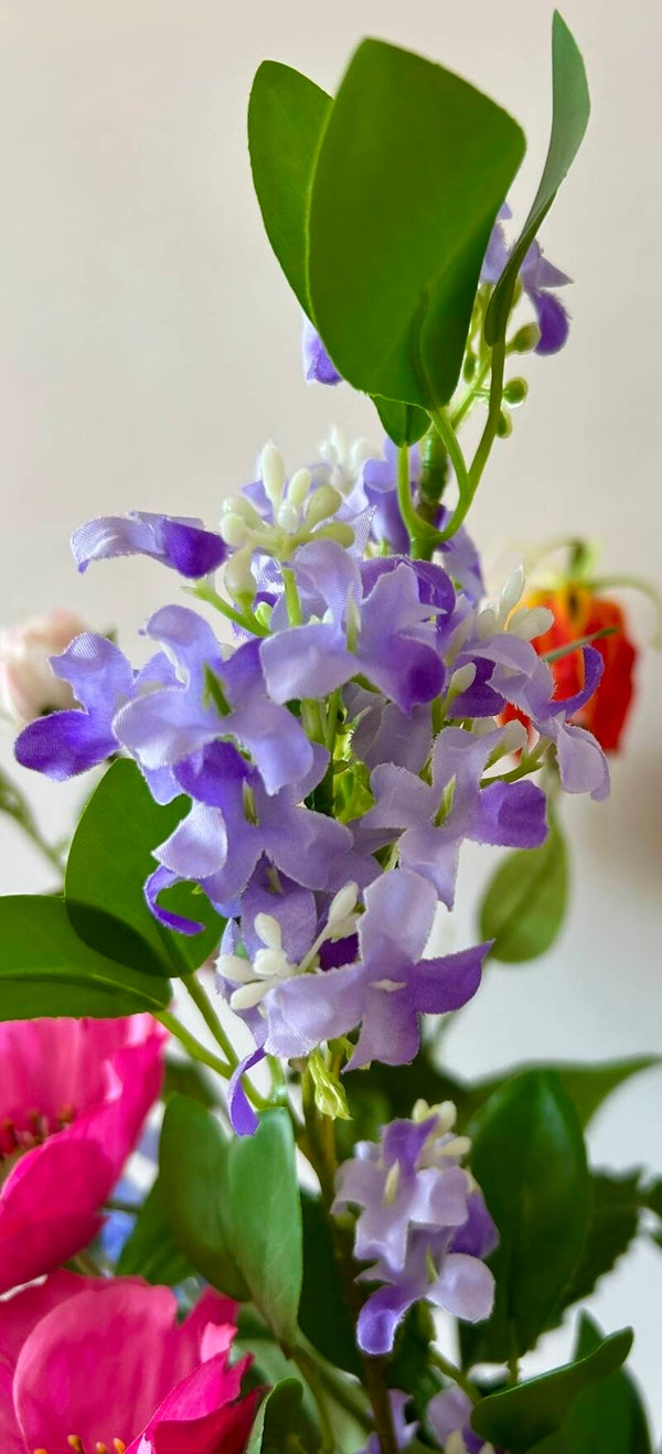 Er zitten veel verschillende takken kunstbloemen in het boeket onder andere: