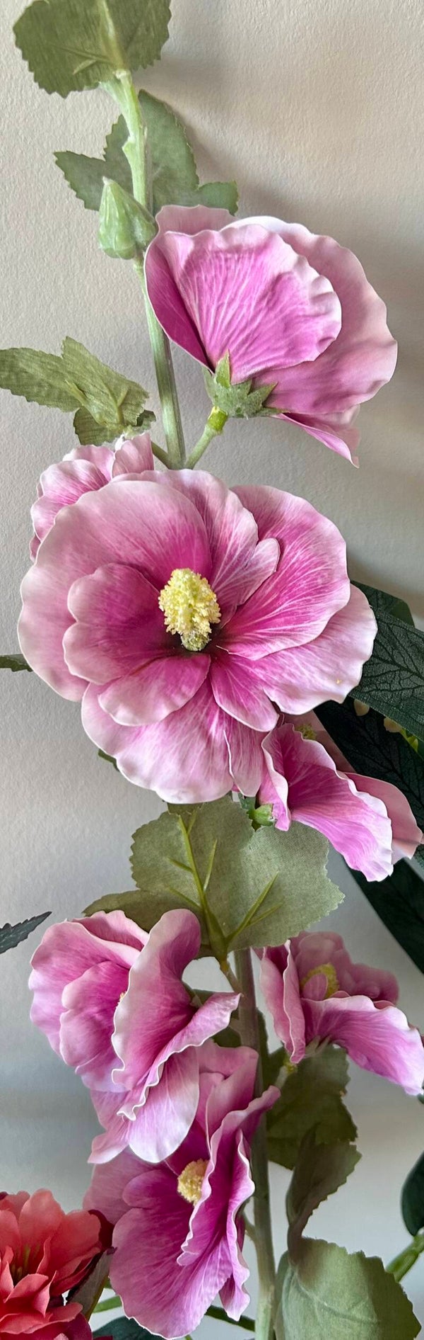 Een super mooie stokroos, veldbloem, grote hortensia, trosroos, eucalyptus en Lotus bloem.