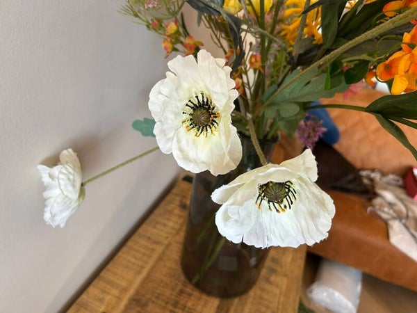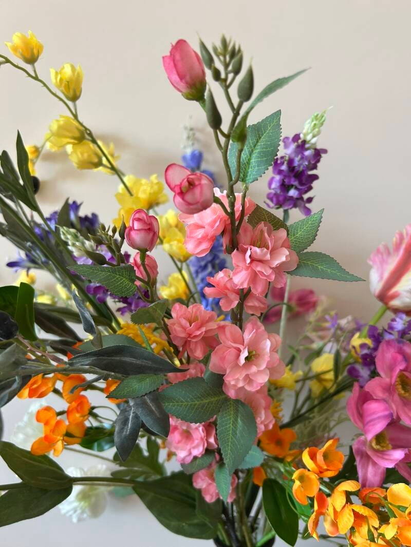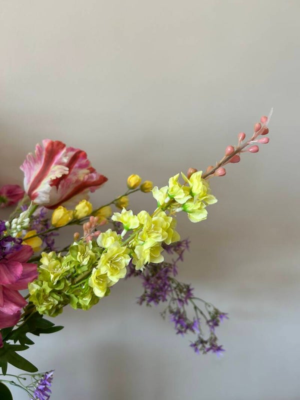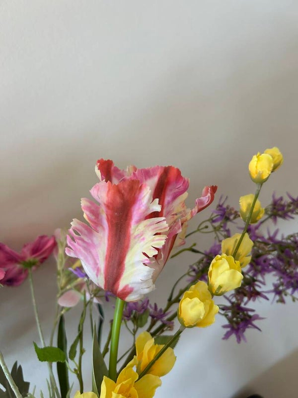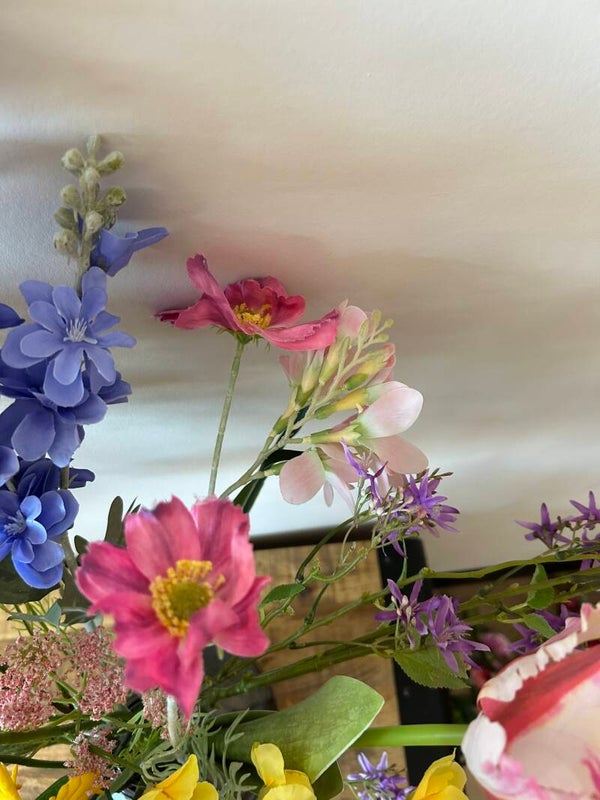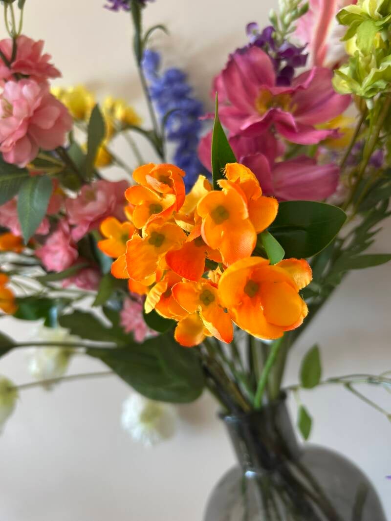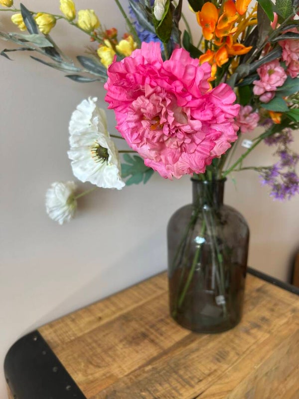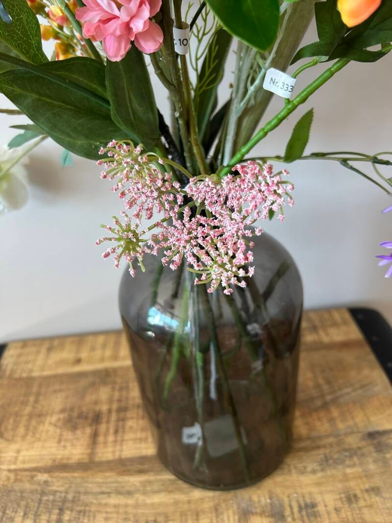 Dit boeket verdient met maar liefst 17 stelen kunstbloemen een prachtige vaas om te kunnen stralen.